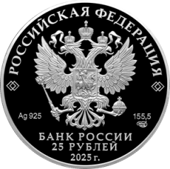 рельефное изображение Государственного герба Российской Федерации, над ним вдоль канта – надпись полукругом «РОССИЙСКАЯ ФЕДЕРАЦИЯ», обрамленная с обеих сторон сдвоенными ромбами, под гербом слева – обозначения драгоценного металла и пробы сплава, справа – содержание химически чистого металла и товарный знак монетного двора, внизу в центре в три строки – надпись «БАНК РОССИИ», номинал монеты «25 РУБЛЕЙ», год выпуска «2025 г.».
