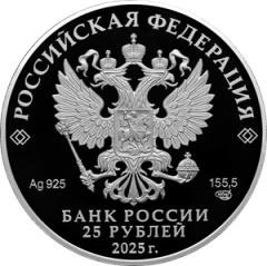 рельефное изображение Государственного герба Российской Федерации, над ним вдоль канта – надпись полукругом «РОССИЙСКАЯ ФЕДЕРАЦИЯ», обрамленная с обеих сторон сдвоенными ромбами, под гербом слева – обозначения драгоценного металла и пробы сплава, справа – содержание химически чистого металла и товарный знак монетного двора, внизу в центре в три строки – надпись «БАНК РОССИИ», номинал монеты «25 РУБЛЕЙ», год выпуска «2025 г.».