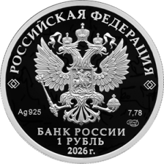 рельефное изображение Государственного герба Российской Федерации, над ним вдоль канта – надпись полукругом «РОССИЙСКАЯ ФЕДЕРАЦИЯ», обрамленная с обеих сторон сдвоенными ромбами, под гербом слева – обозначения драгоценного металла и пробы сплава, справа – содержание химически чистого металла и товарный знак монетного двора, внизу в центре в три строки – надпись «БАНК РОССИИ», номинал монеты «1 РУБЛЬ», год выпуска «2026 г.».
